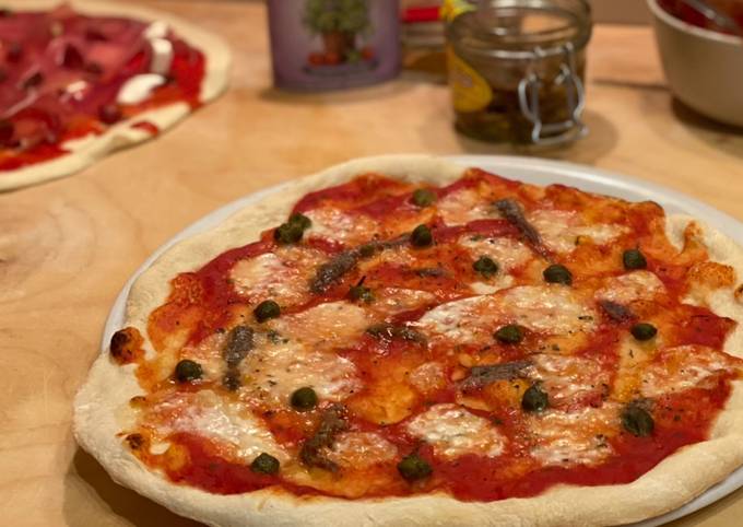 - Für die Pizza im Foto habe ich nur Tomatensauce (verfeinert mit Salz und Oregano), Kapern und Sardellen verwendet. Und natürlich Mozzarella. Less is more für mich bei Pizza, aber das ist Geschmacksache..